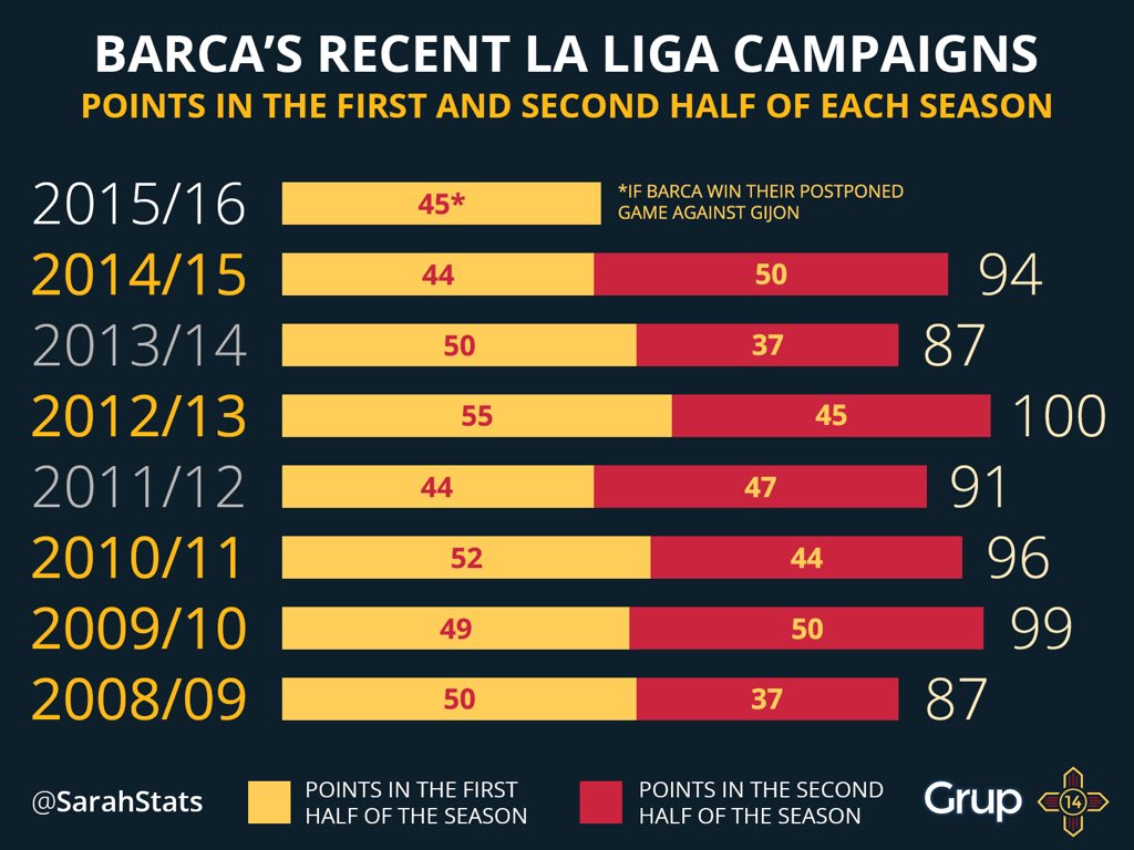 Comparing Barça's points in the first and second half of each season: