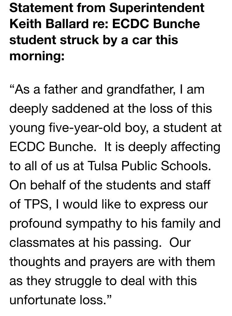 Statement from Tulsa Public Schools Superintendent regarding 5-year-old student who was hit and killed by a car.
